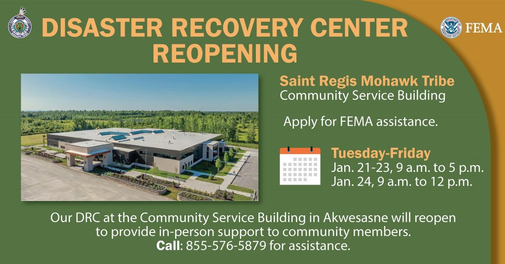 Disaster Recovery Center Reopening Today! The Disaster Recovery Center at the Saint Regis Mohawk Tribe reopens today!